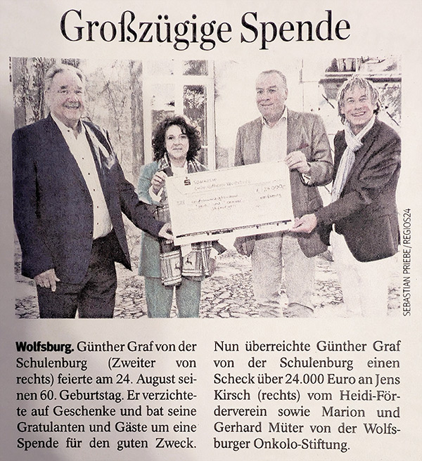 Anlässlich seines 60. Geburtstages hat der Graf von der Schulenburg auf persönliche Geschenke verzichtet und stattdessen um Spenden für die Onkolo Stiftung und den Heidi Förderverein gebeten.